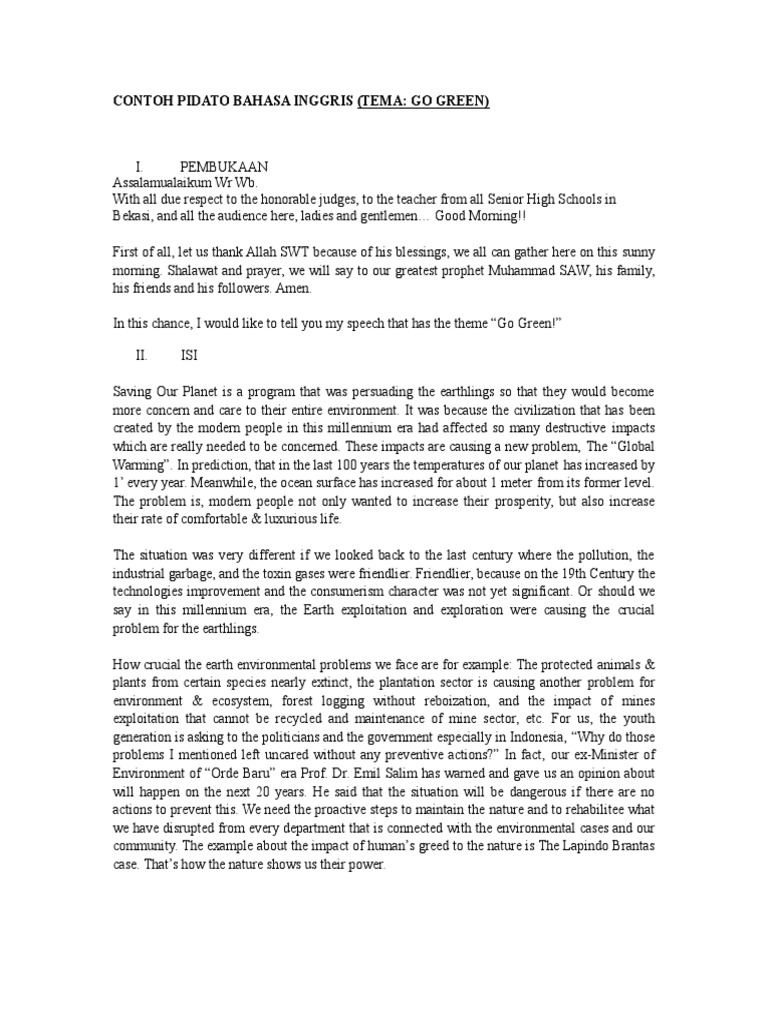 Tingkatan Form 1 2 3. Contoh Pidato Bahasa Inggris Tentang Lingkungan Assalamualaikum WR WB Before I start to provide this speech I would love to invite you to thank to Allah the Almighty That has given us Grace as well as True blessing so we can fulfill with each other in this blessing area. Before I begin the speech I d like to introduce myself.